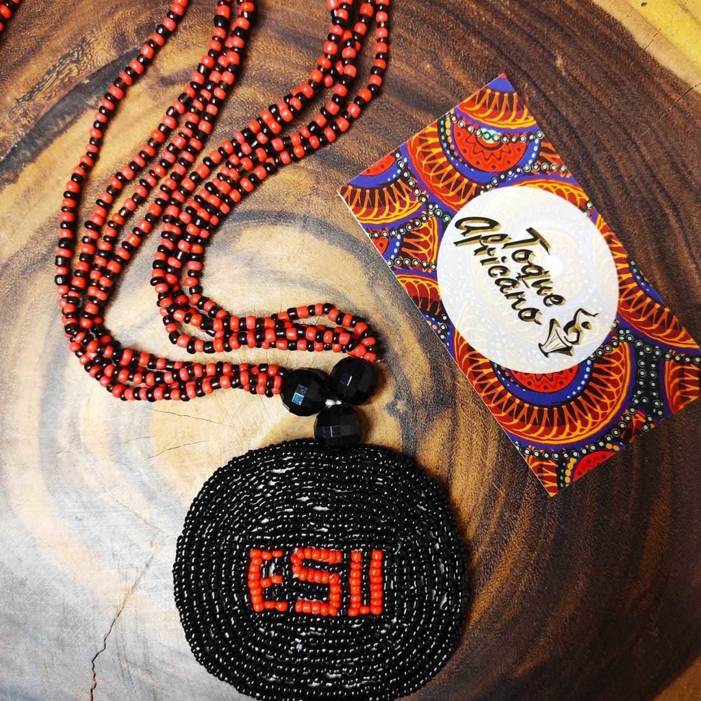 Colar feito com miçangas na cor preto e vermelho e com a palavra 'Esu'' escrito na frente/verso.